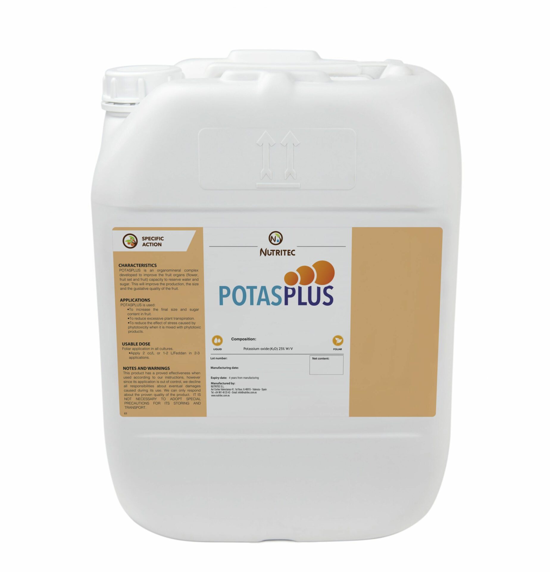 POTASPLUS est un complexe organominéral développé pour renforcer l’effet réservoir des organes fructifères augmentant ainsi le contenu en eau et en sucre et améliorant la production, le calibre et la qualité gustative des fruits.